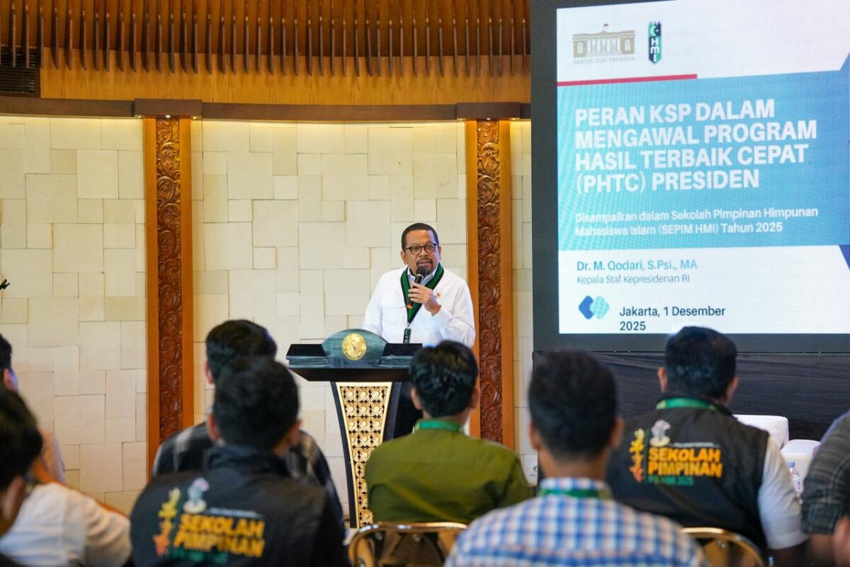 Jakarta – Kepala Staf Kepresidenan Muhammad Qodari mendorong para pemuda Himpunan Mahasiswa Islam (HMI) untuk menemukan minat, potensi terbaik, serta berani menjadi yang terdepan di bidang masing-masing dalam rangka menyongsong Indonesia Emas 2045. Hal tersebut disampaikan Qodari saat memberikan materi pada kegiatan Sekolah Pimpinan HMI (SEPIM) 2025 bertema “Penguatan Kompetensi Komunikasi Publik, Negosiasi dan Diplomasi Kader HMI untuk Pembangunan Bangsa”, yang dihadiri 167 kader perwakilan cabang HMI dari seluruh Indonesia, di Gedung Caping Gunung, TMII Jakarta, Senin (01/12/2025).