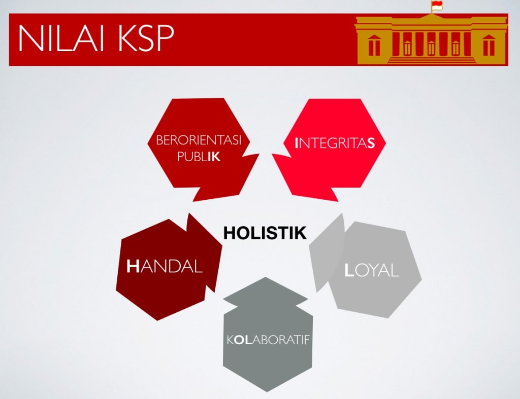 Dalam melaksanakan tugas dan fungsi seperti yang dimaksud di atas, seluruh tenaga profesional di Kantor Staf Presiden wajib menjunjung nilai holistik yang menekankan pentingnya keseluruhan dan saling keterkaitan. Nilai KSP digambarkan sebagai berikut: