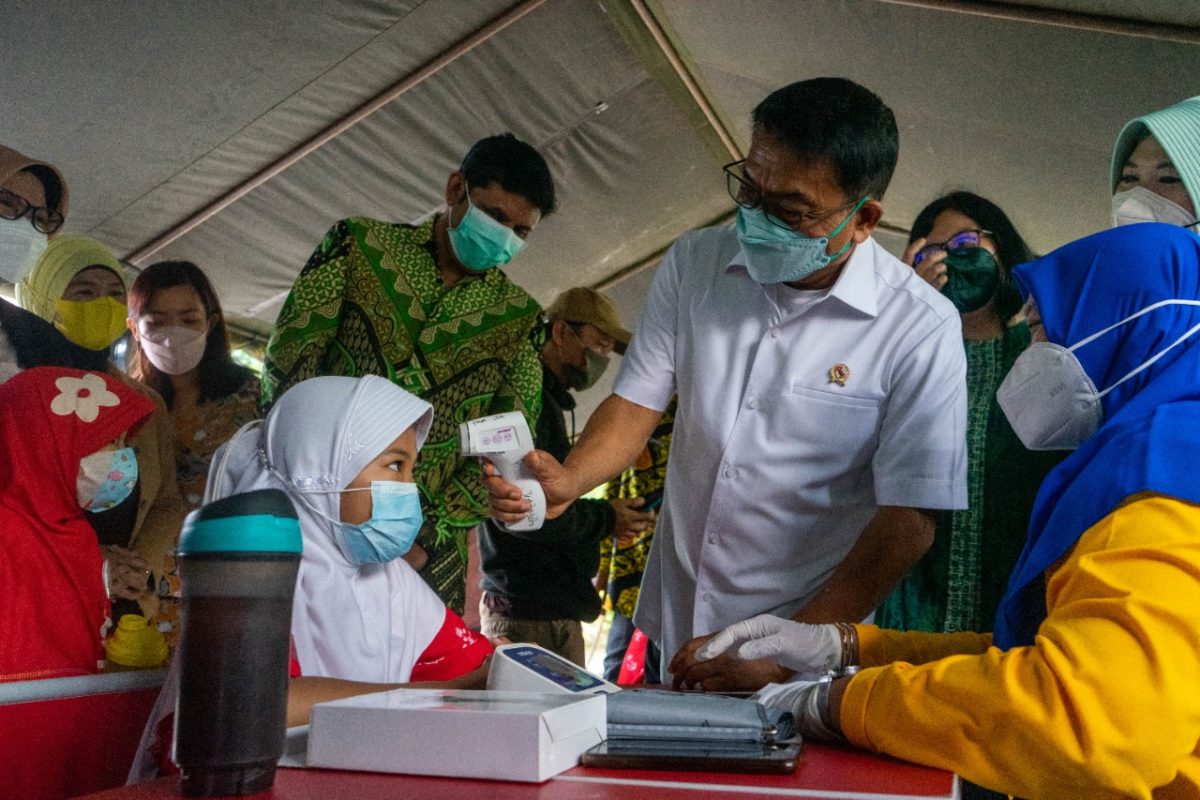 “Ayo vaksin dulu, biar kuat dan sehat. Biar nanti bisa segera sekolah tatap muka,” celetuk Moeldoko pada para siswa.