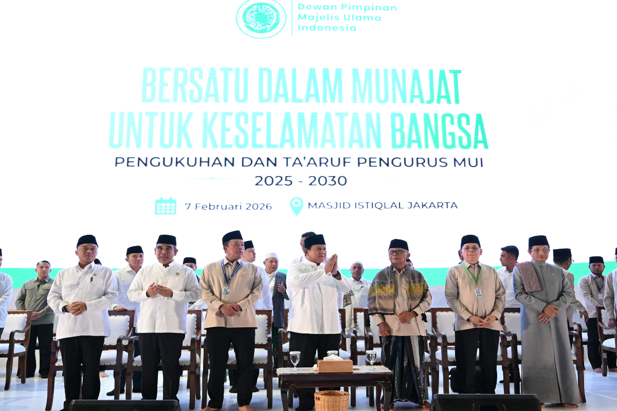 Presiden Prabowo Subianto menghadiri acara Bersatu dalam Munajat untuk Keselamatan Bangsa serta Pengukuhan dan Ta’aruf Pengurus Majelis Ulama Indonesia (MUI) Masa Khidmat 2025–2030 yang diselenggarakan di Masjid Istiqlal, Jakarta pada Sabtu, 7 Februari 2026. Kegiatan tersebut diikuti puluhan ribu jemaah dari berbagai unsur umat Islam dan lembaga keagamaan.